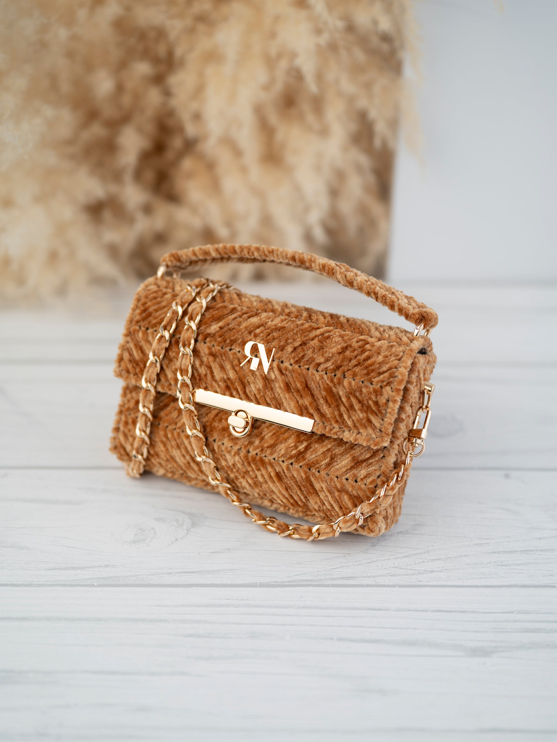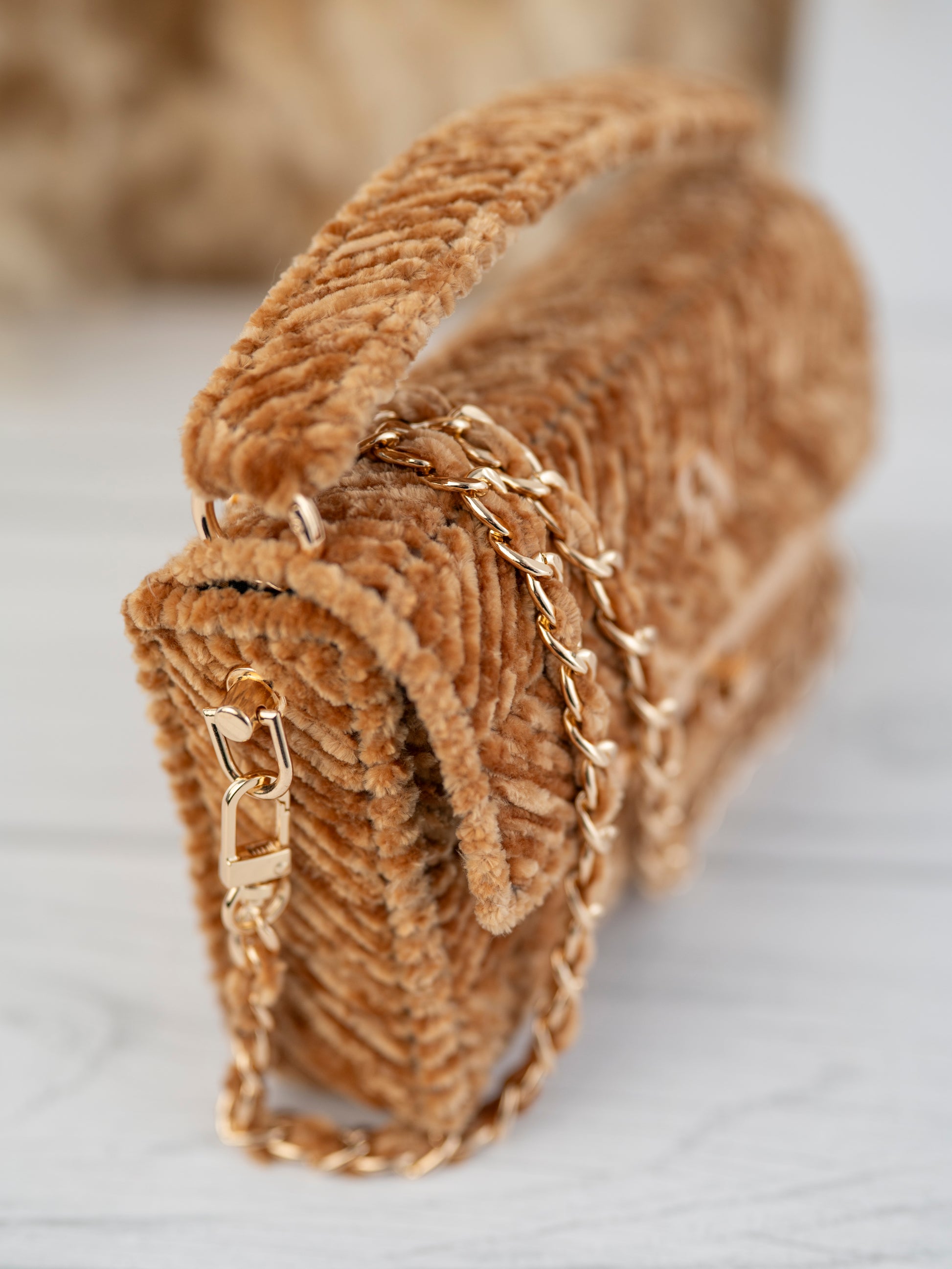 Elevate your look with our EVA bag in luxurious honey velvet yarn. Complete with elegant gold accessories and an animal print lining, this bag is perfect for your special occasions as weddings, cocktails, or proms. Make a statement with this chic and sophisticated accessory.
