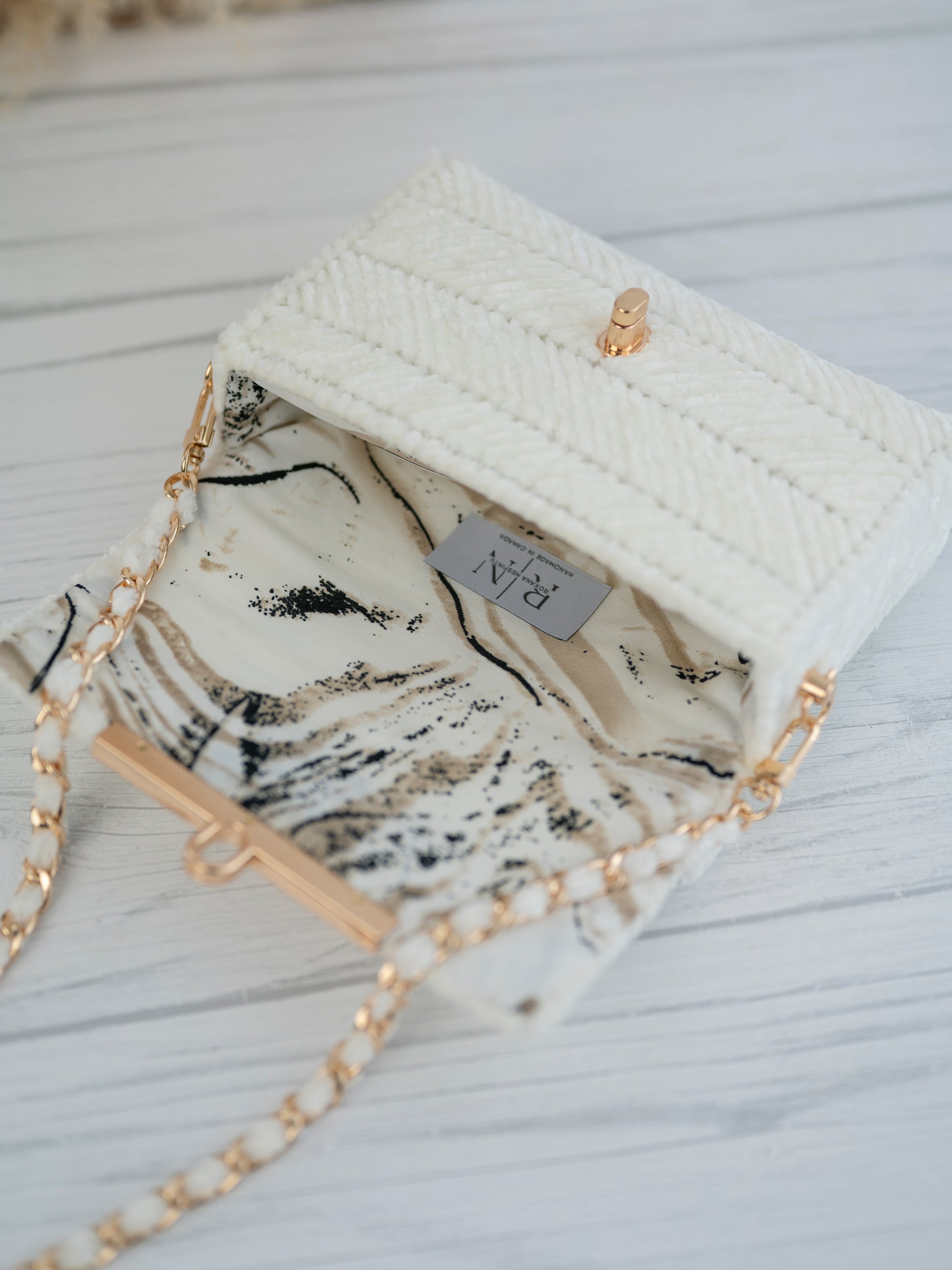 Elevate your look with our EVA bag in luxurious icecream velvet yarn. Complete with elegant gold accessories and an abstract print lining, this bag is perfect for your special occasions as weddings, cocktails, or proms. Make a statement with this chic and sophisticated accessory.