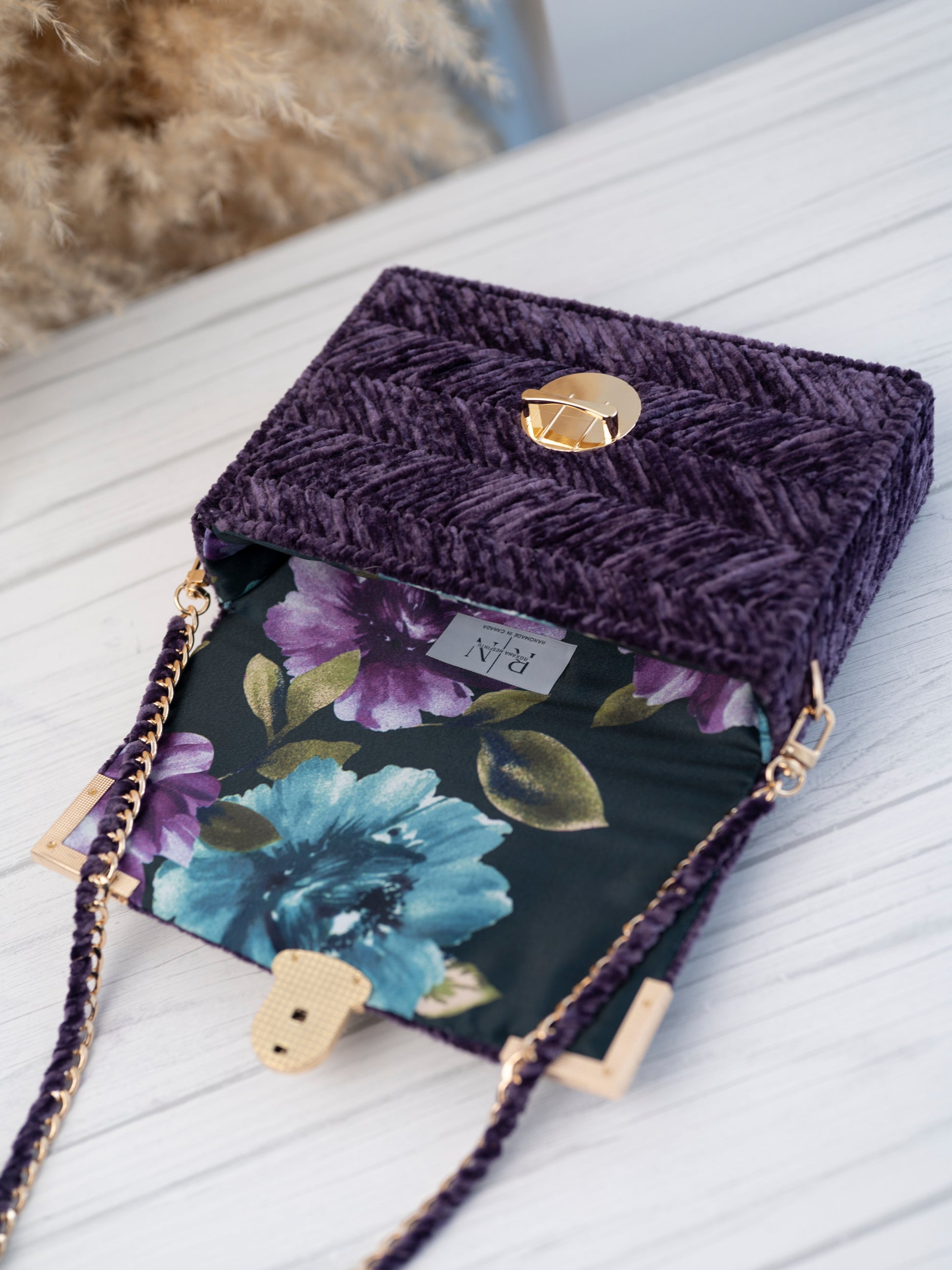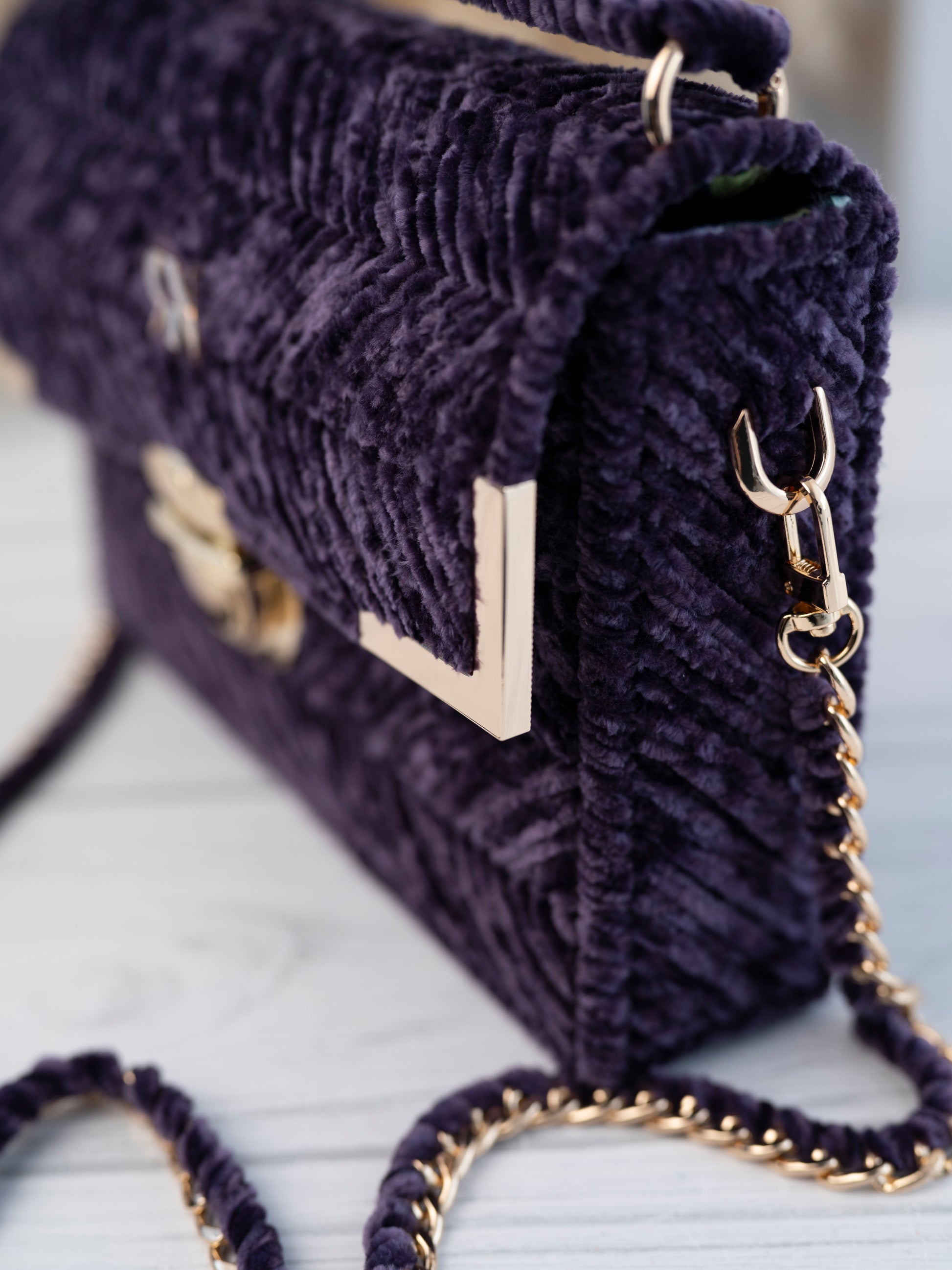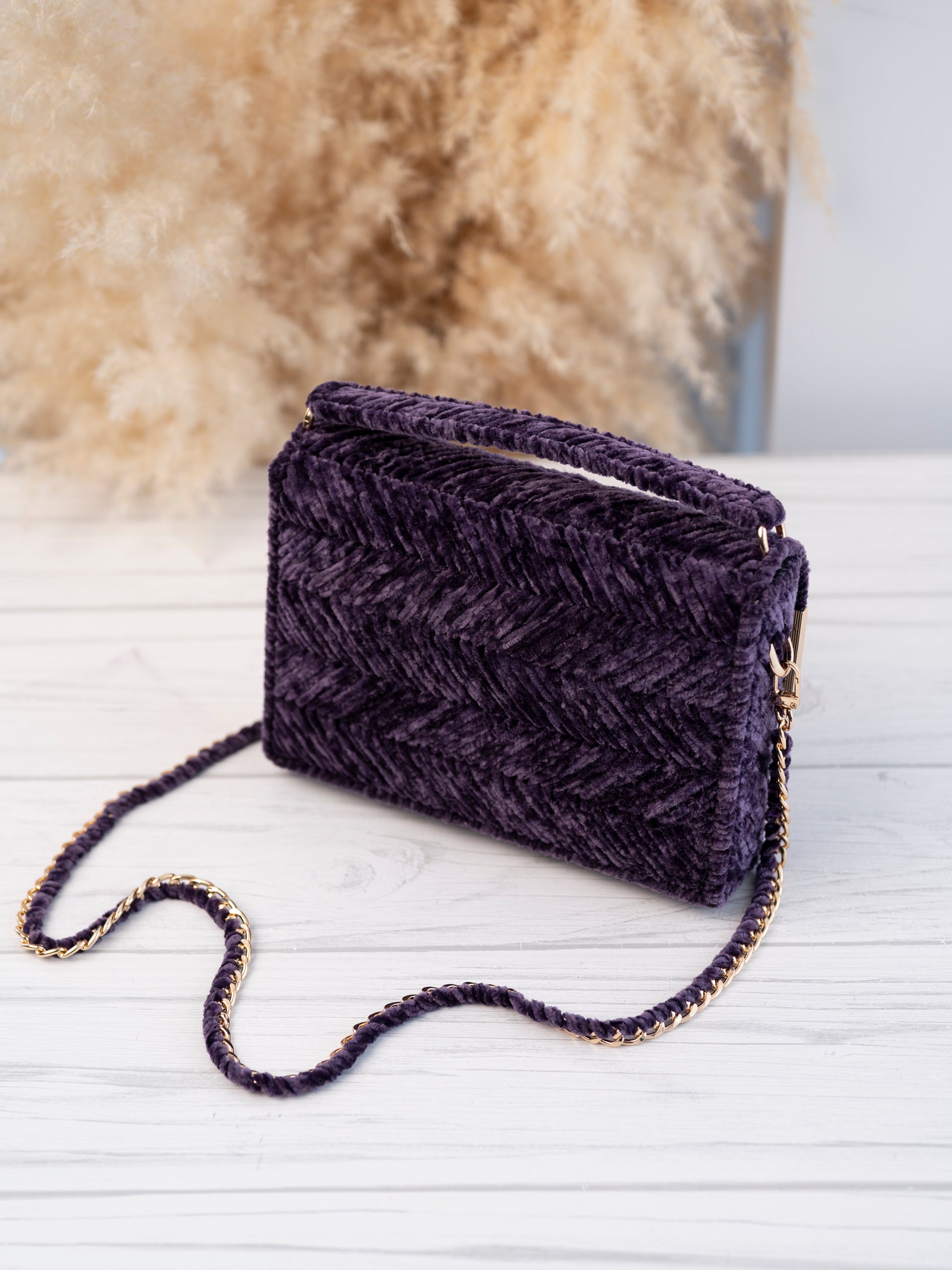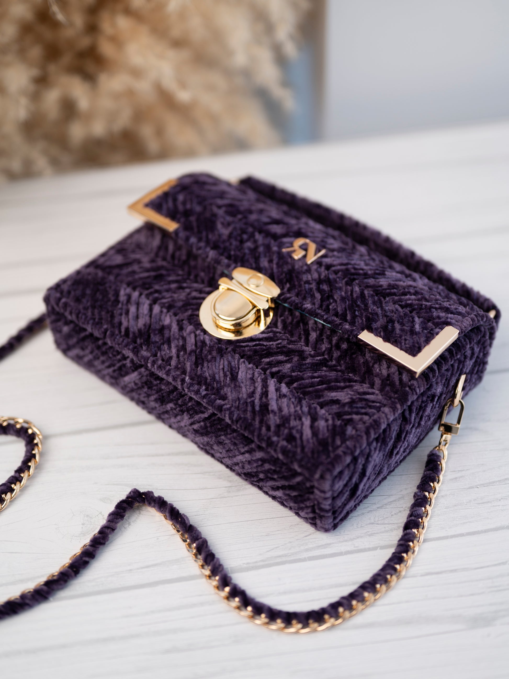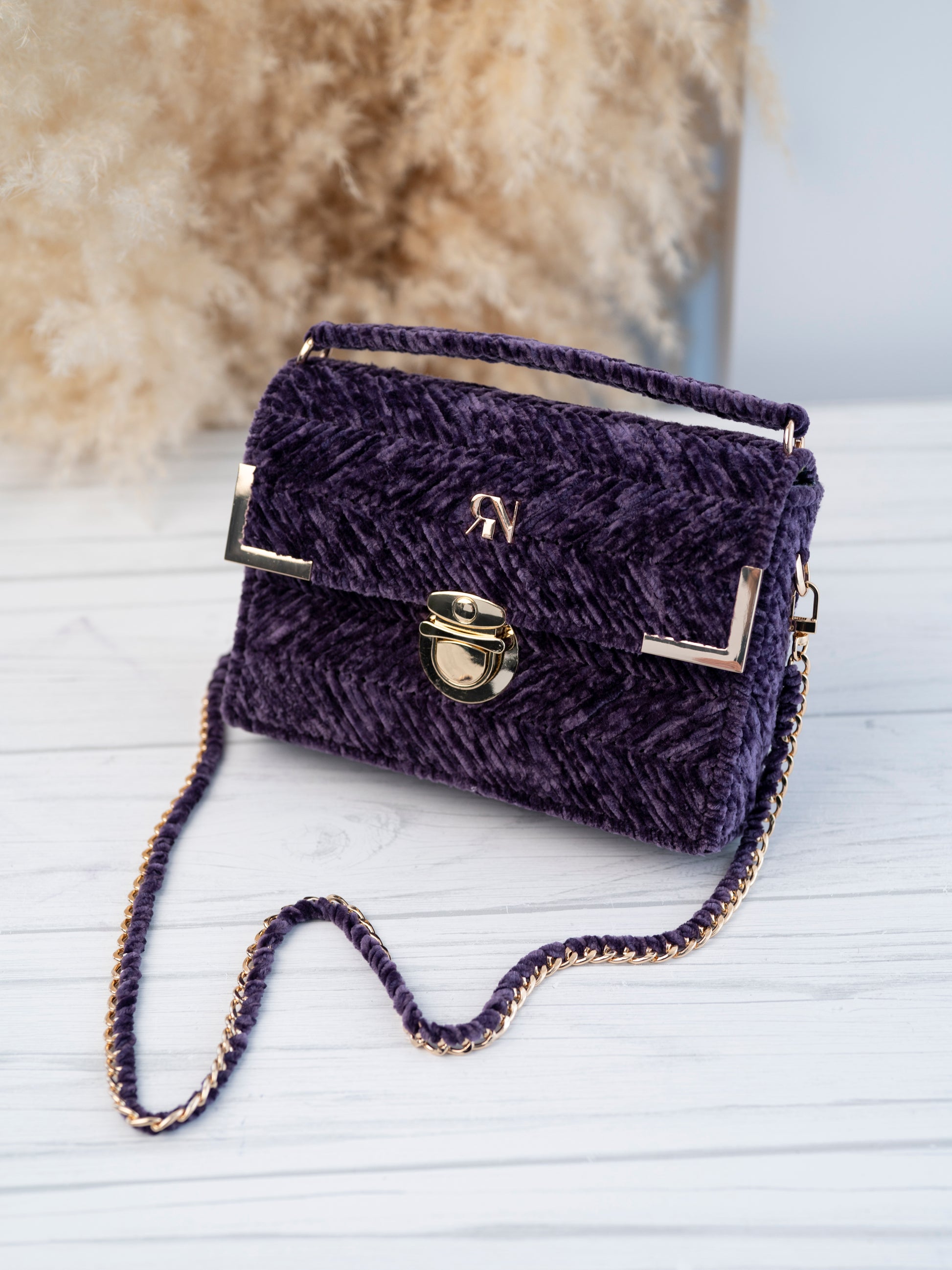 Micah bag in purple velvet exudes vintage charm and boasts a bold colour that is soft to the touch. Adorned with gold accessories, it is a statement piece for your special occasion. Elevate your style with MICAH.