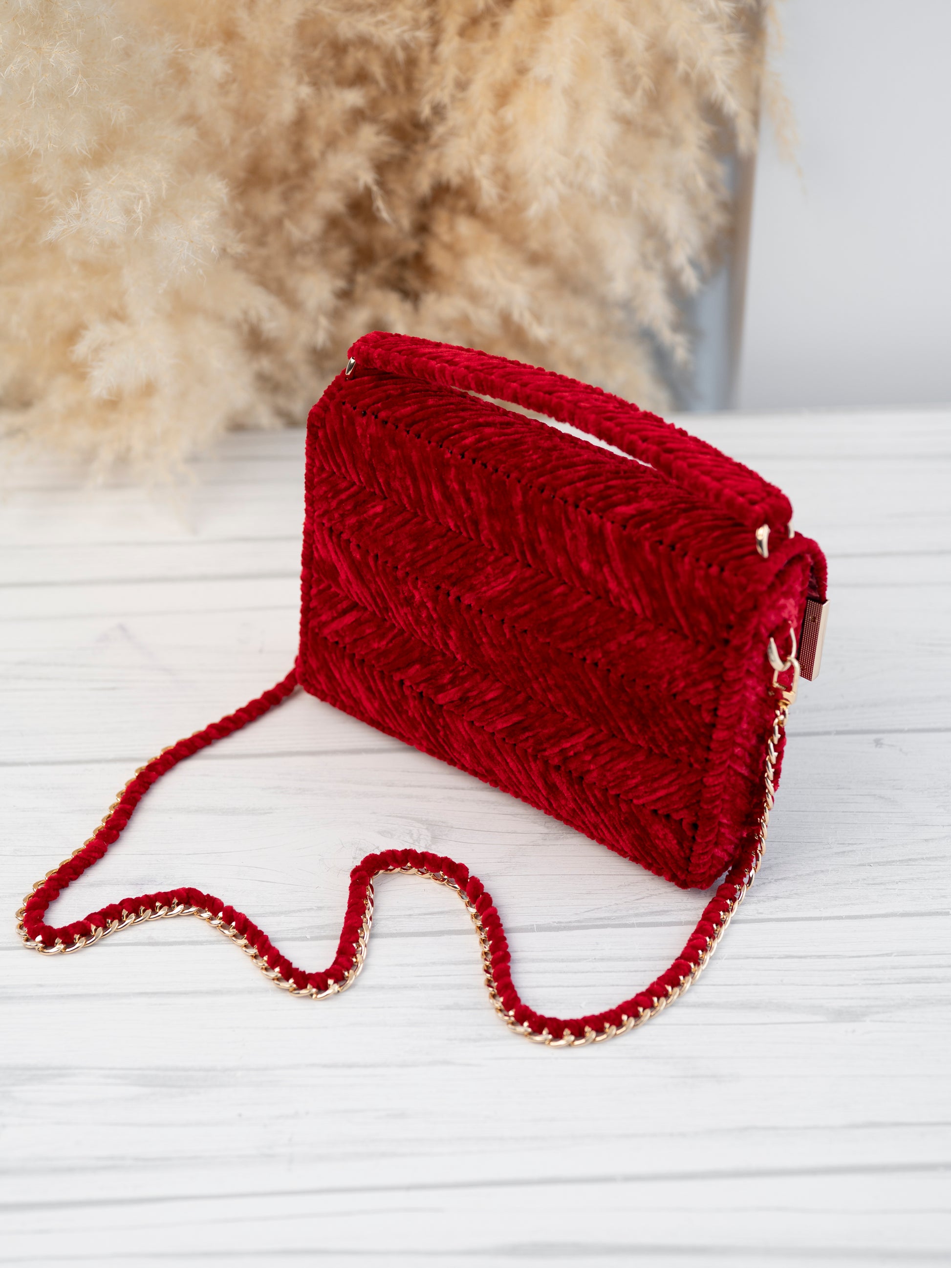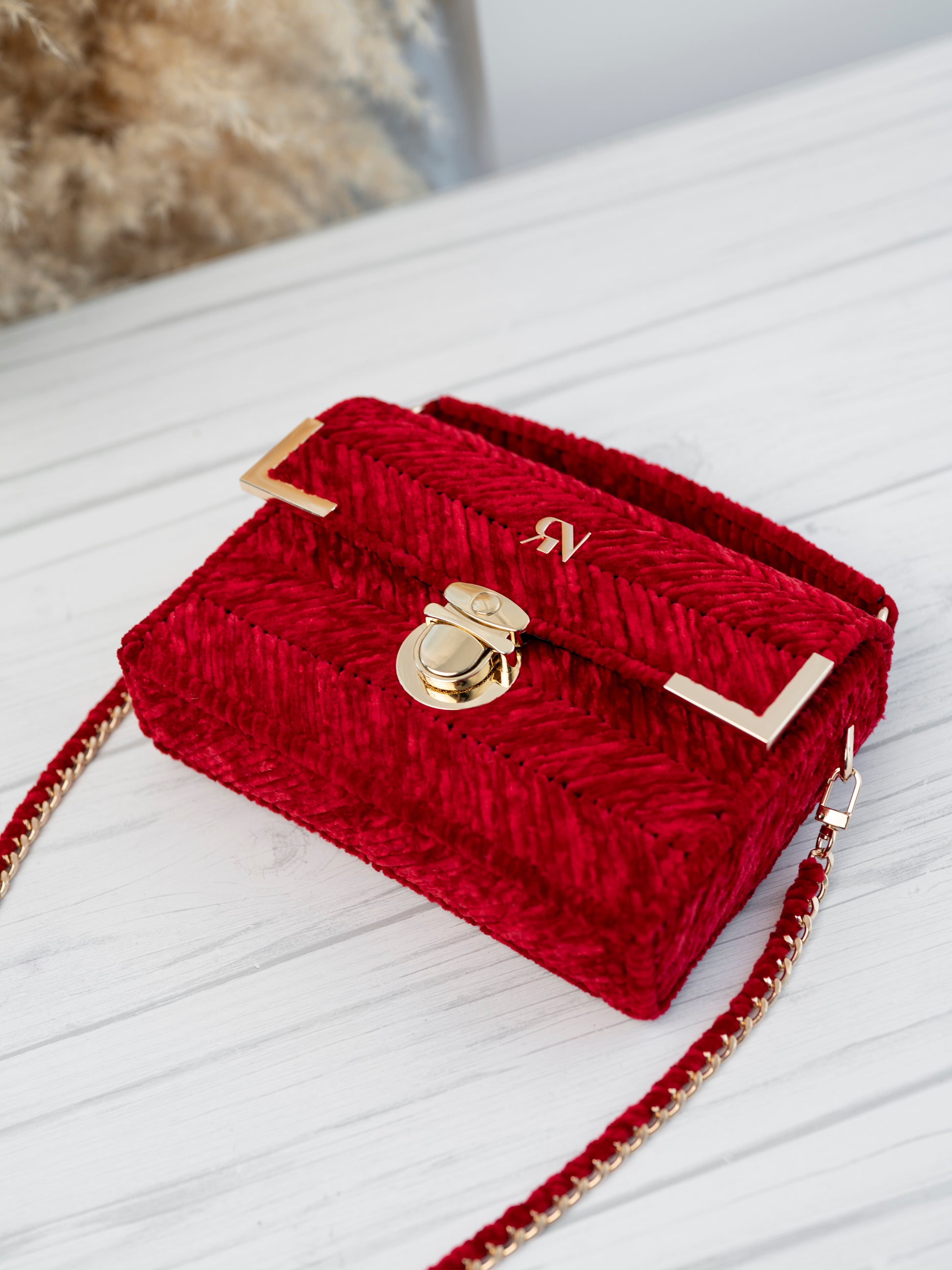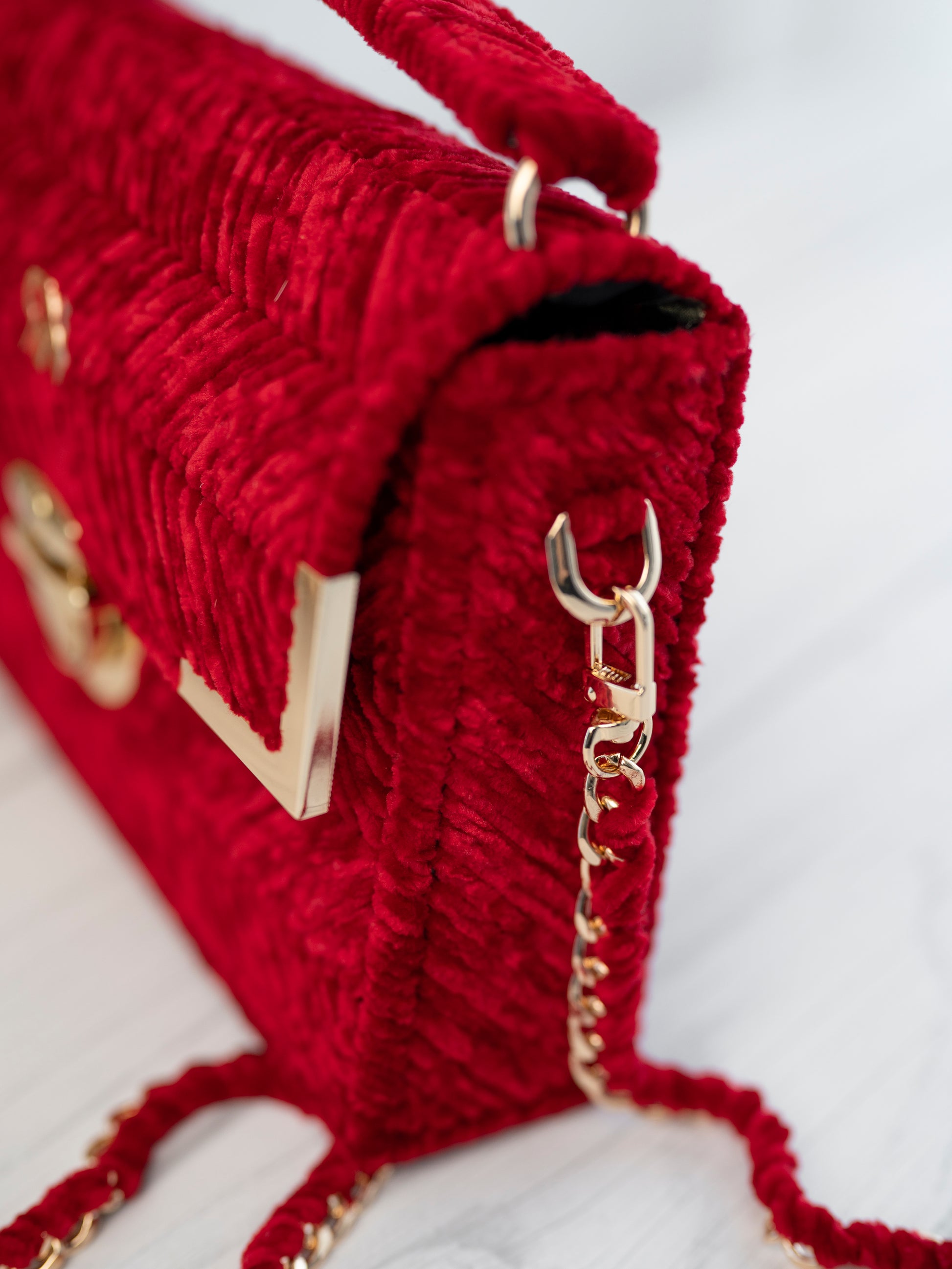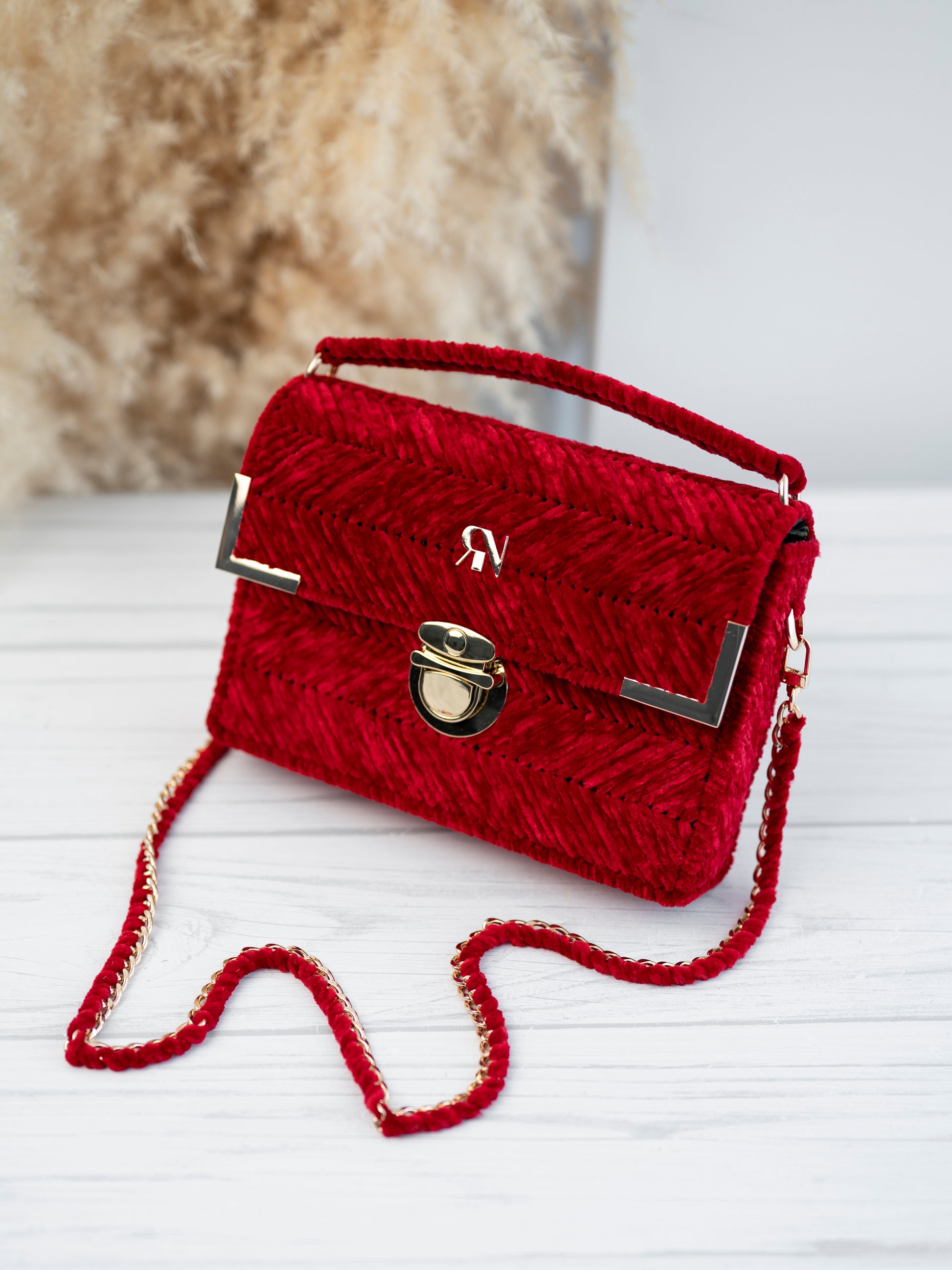 Micah bag in red velvet exudes vintage charm and boasts a bold colour that is soft to the touch. Adorned with gold accessories, it is a statement piece for your special occasion. Elevate your style with MICAH.