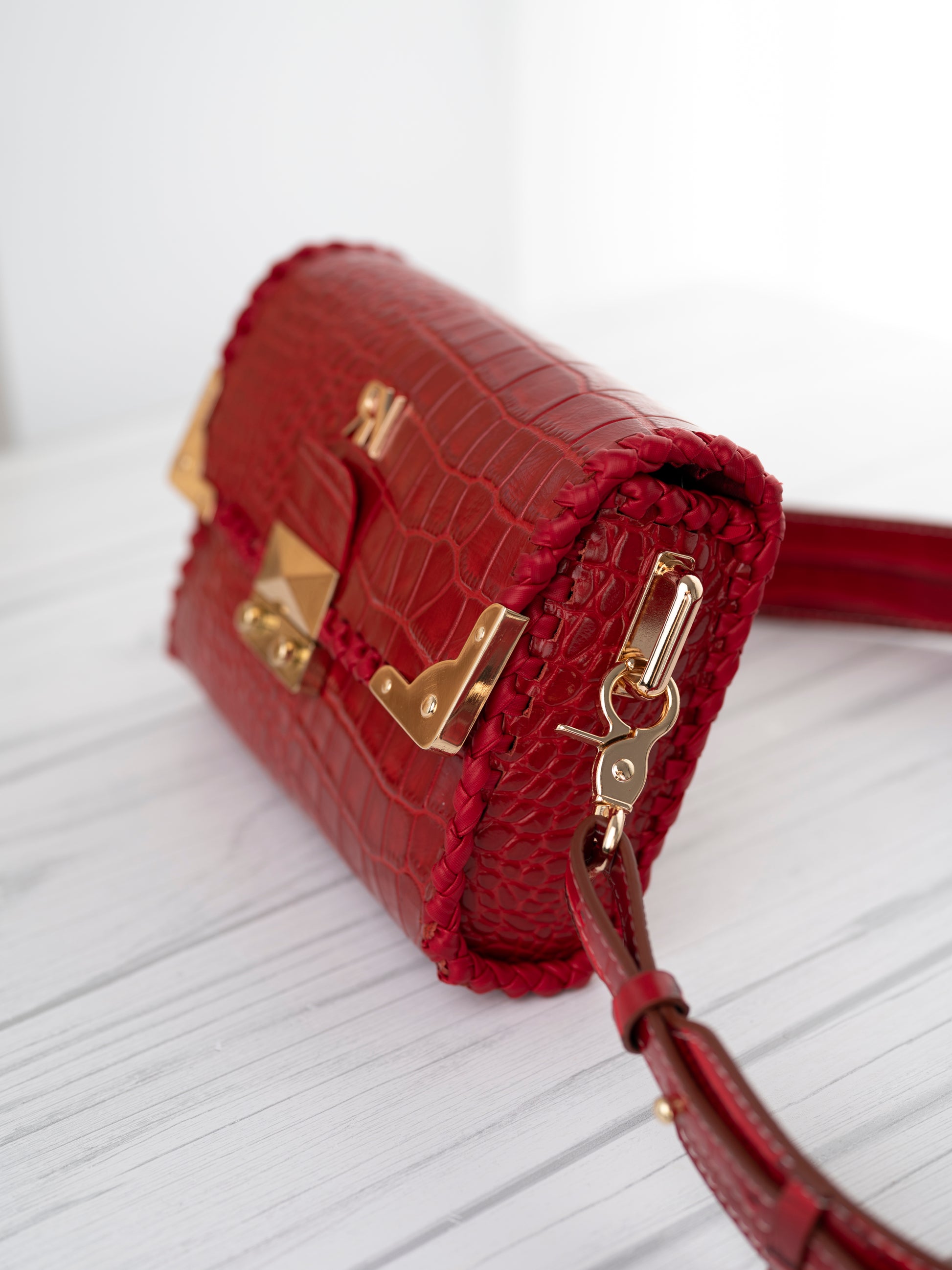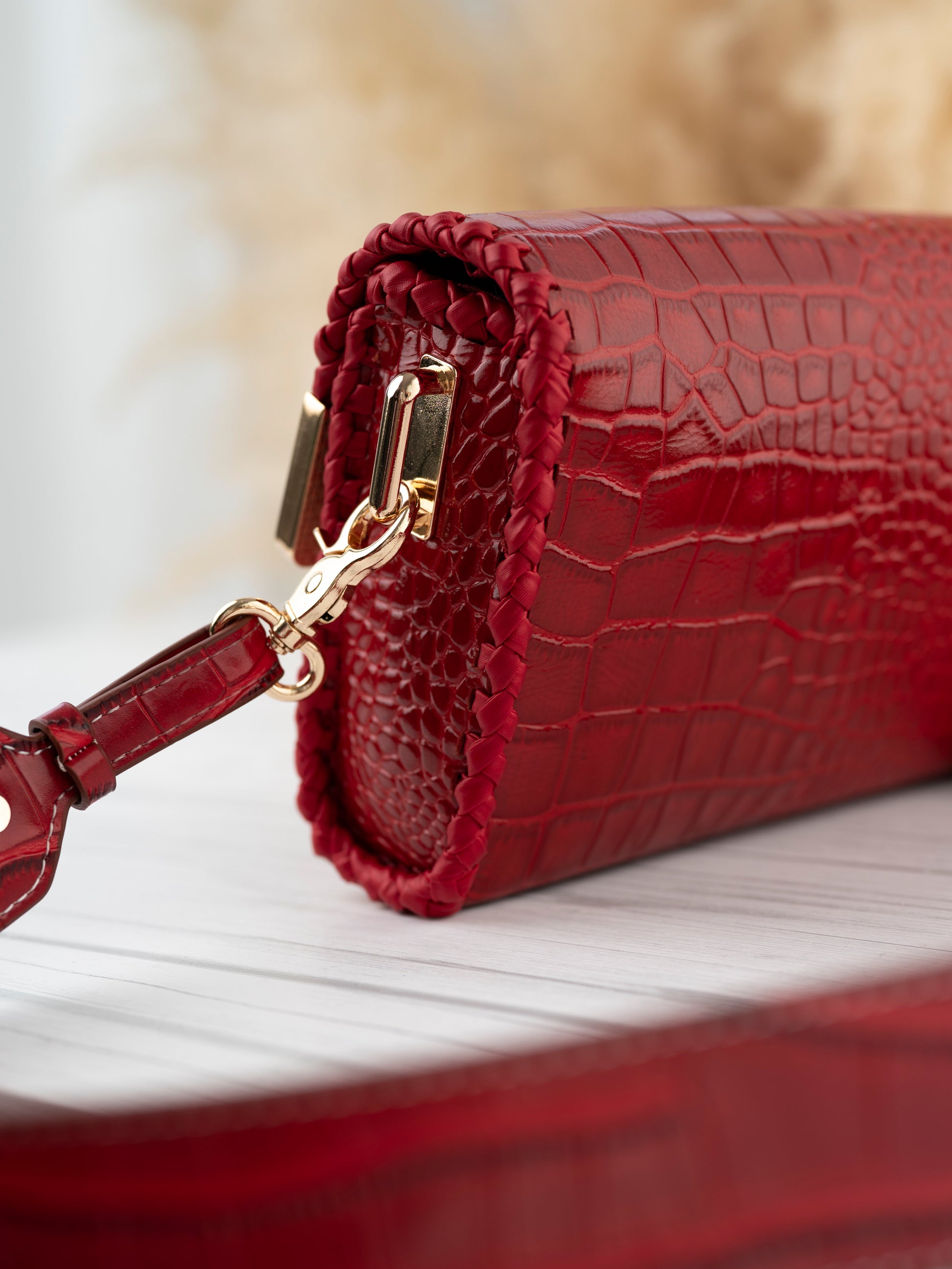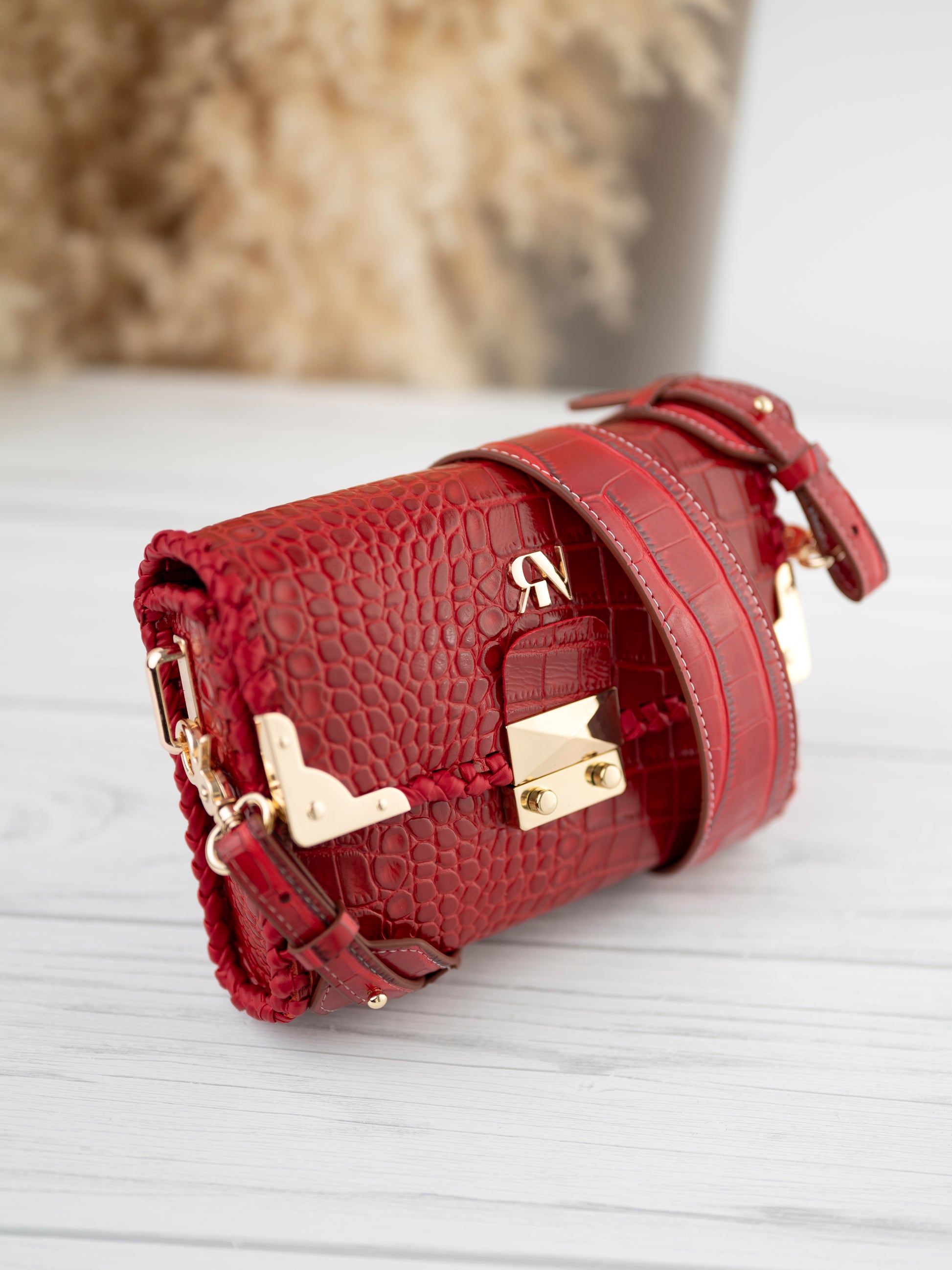 The Paris bag is crafted from genuine cowhide leather embossed in a luxurious crocodile texture, finished in a striking scarlet red hue. Its bold color contrasts beautifully with the hand-woven navy edging and the gleaming gold-tone hardware, giving it an aura of modern elegance and timeless craftsmanship.