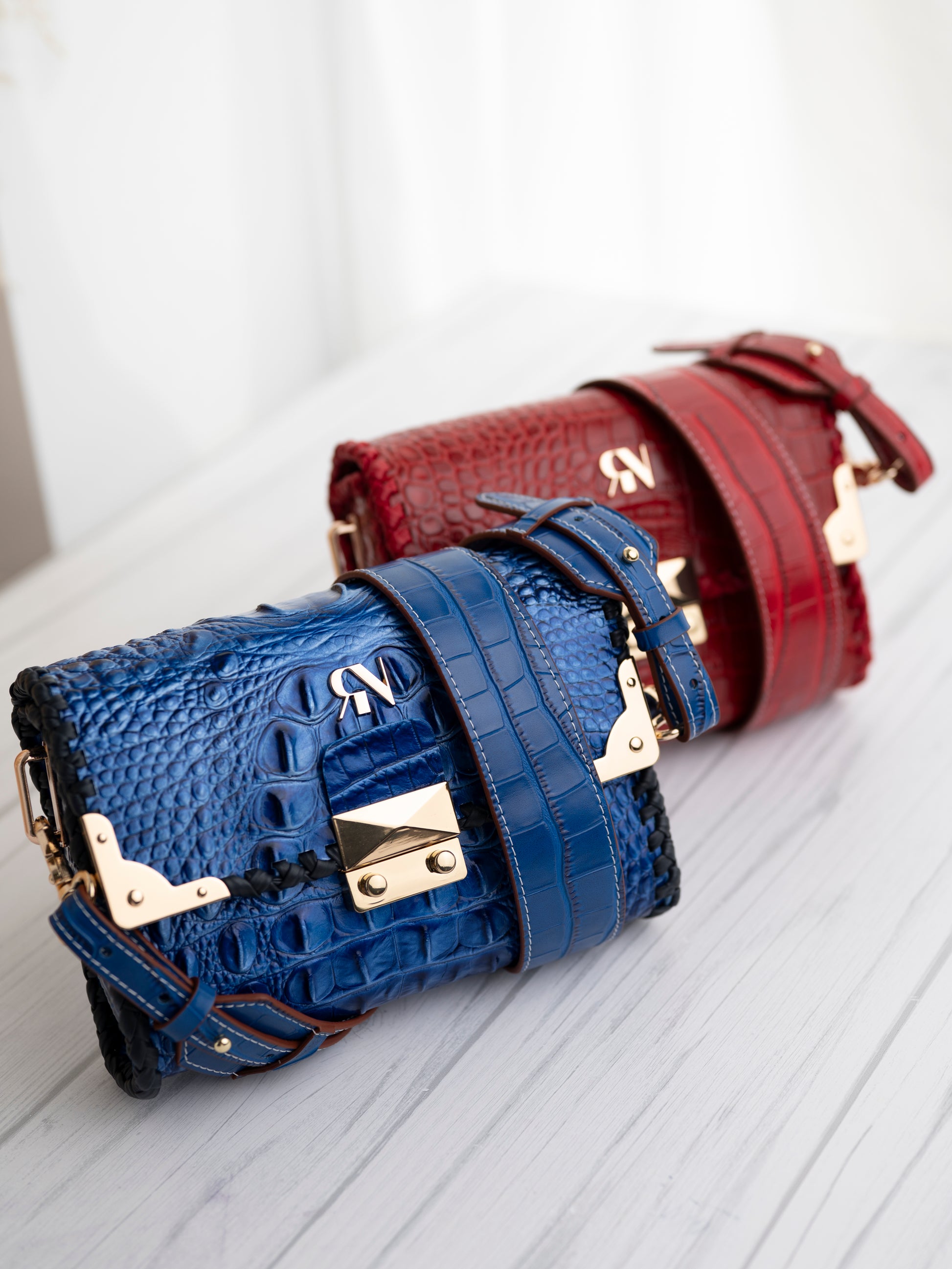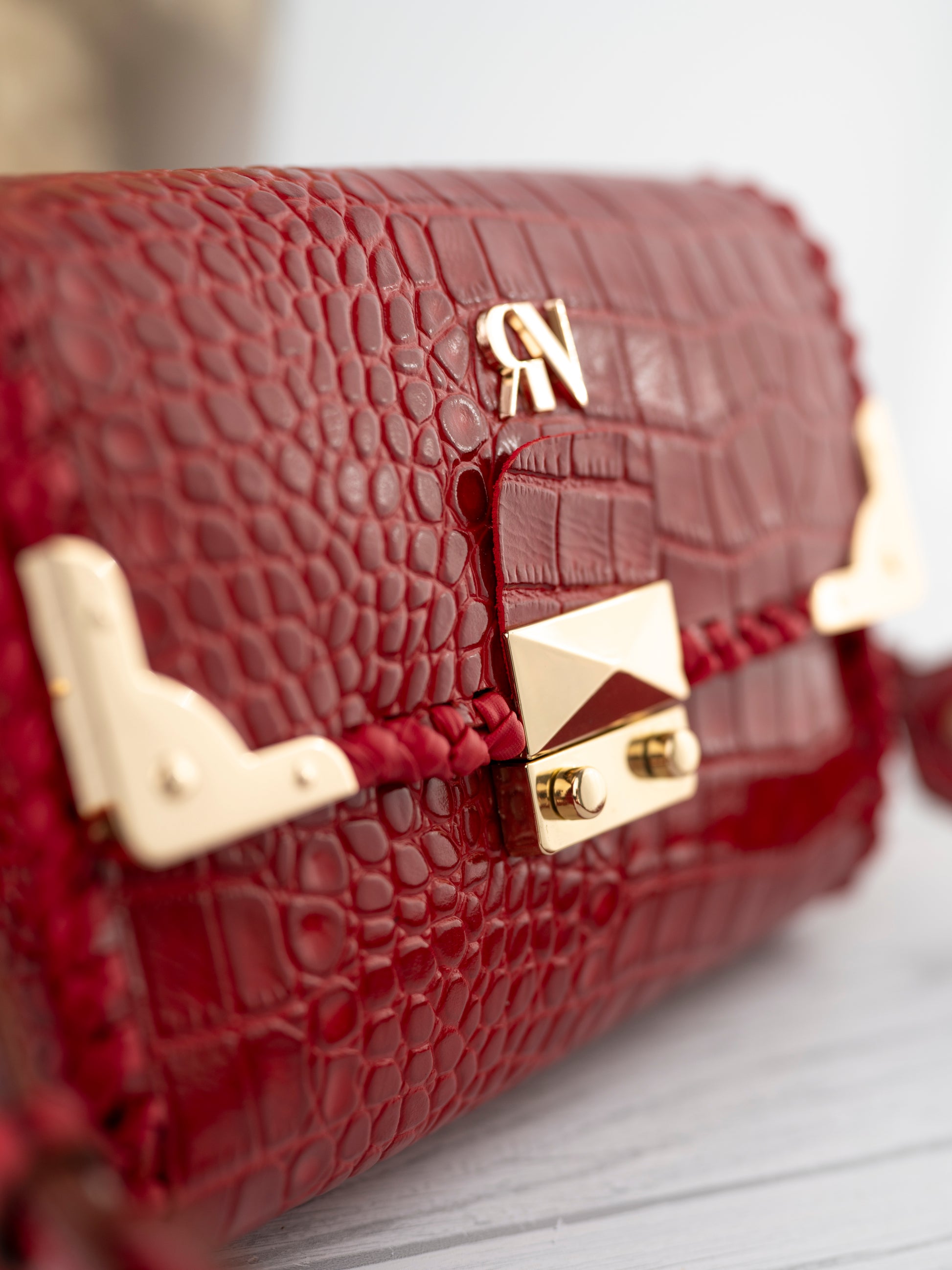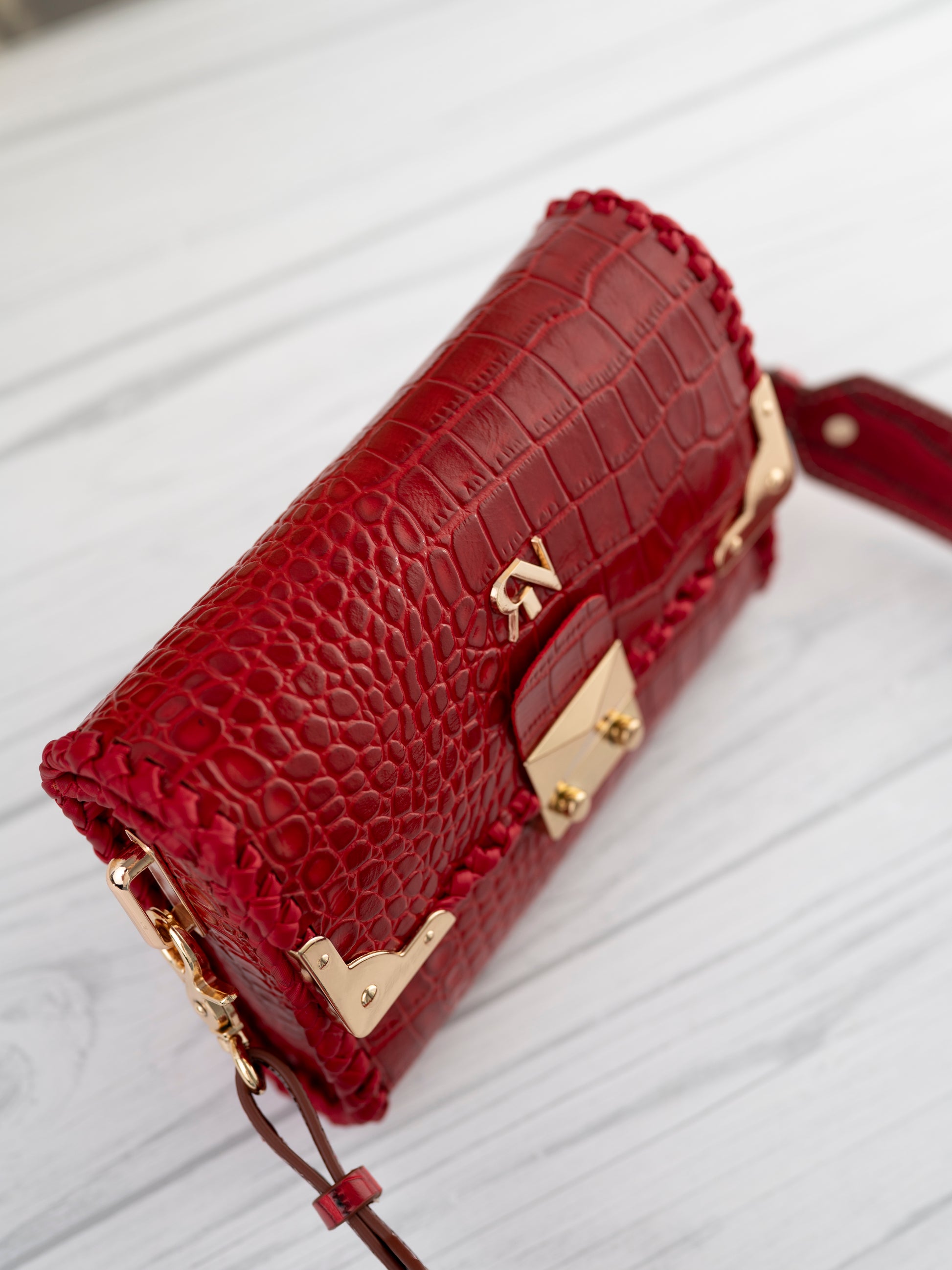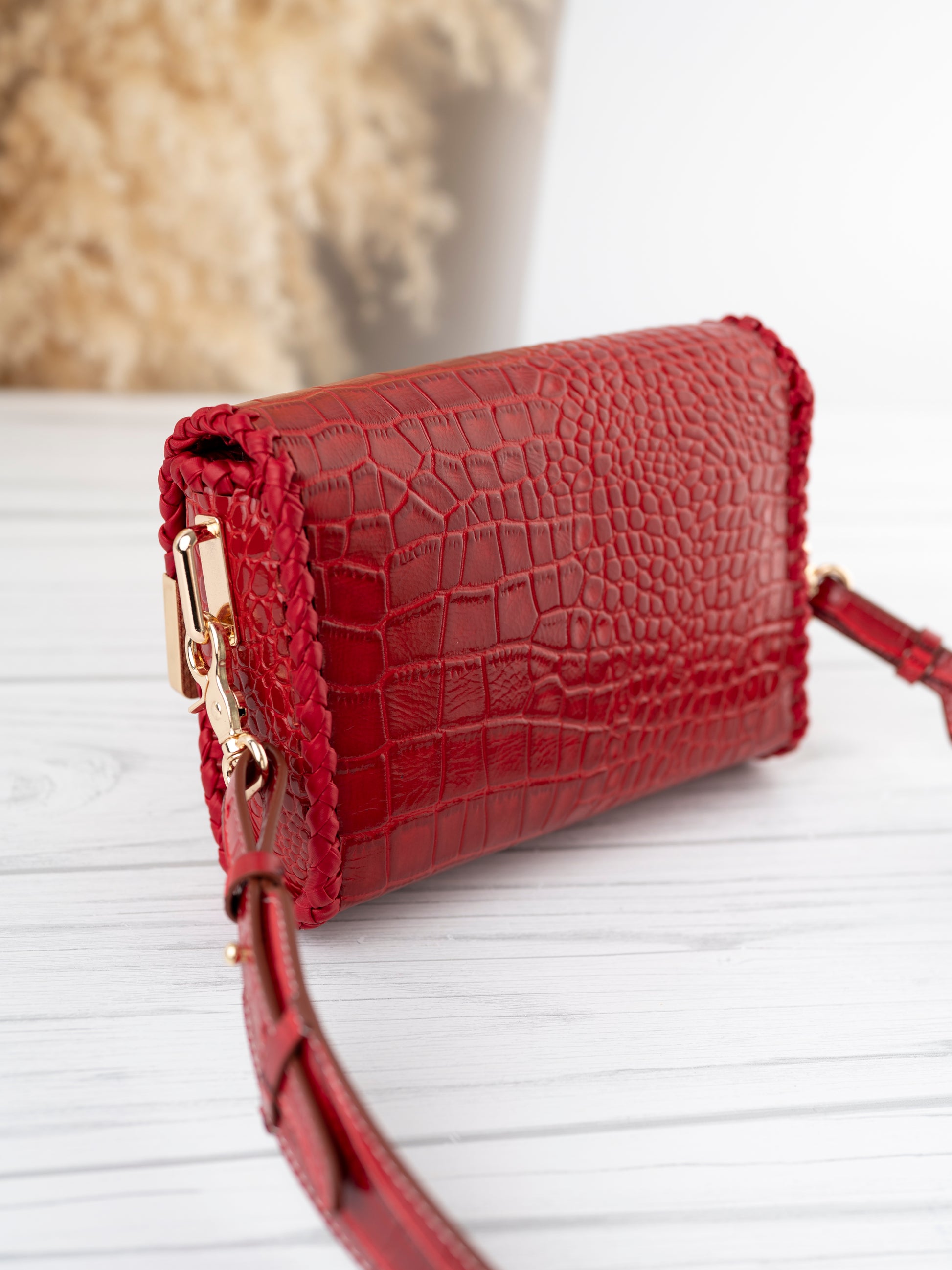The Paris bag is crafted from genuine cowhide leather embossed in a luxurious crocodile texture, finished in a striking scarlet red hue. Its bold color contrasts beautifully with the hand-woven navy edging and the gleaming gold-tone hardware, giving it an aura of modern elegance and timeless craftsmanship.